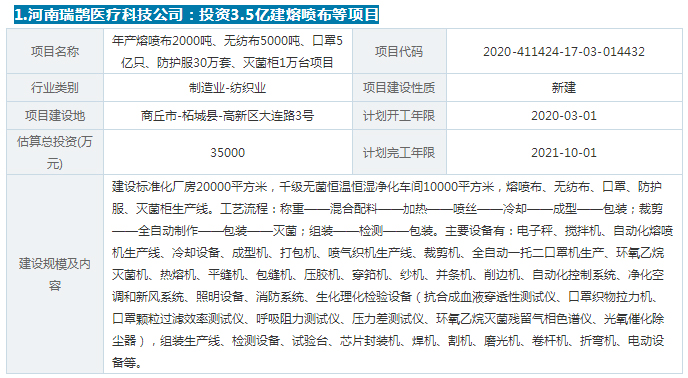 筆者從河南省企業項目備案系統了解到,自4月初至今,不到一個月的時間內,河南省這個區域內,有至少20家企業計劃建設熔噴布、口罩等項目,投資額從幾百萬元到幾千萬元不等。
